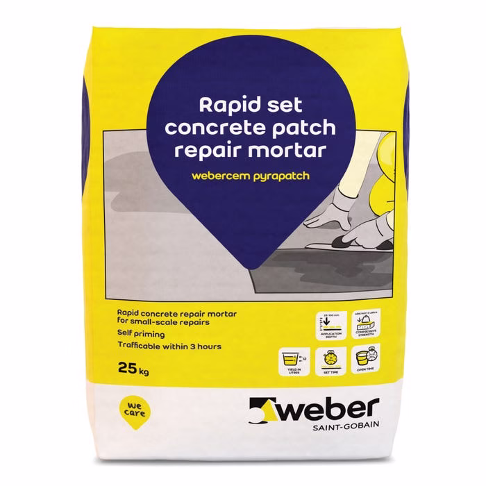 Fast-setting repair concrete for pavement patch or full-depth repairs. webercem pyrapatch is a pre-packed product based on hydraulic cements with specially graded non-reactive aggregates. The product is polymer-modified which, when mixed with clean water, produces a fast setting repair concrete, suitable for patch or full-depth repairs up to 2m².