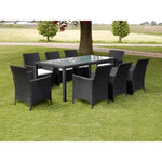• Delivery includes 1 table with a glass top, 8 rattan chairs and 8 removable seat cushions