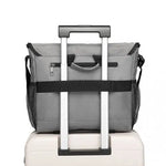 The bag has an adjustable shoulder strap, a top handle and a strap on the back for attaching to the luggage.