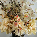 Large blossom spray stem with silkflowers and a wired shapable stem. This particular design is slightly less rigid than some of our blossom stems so is ideal for creating arrangements with a slight trailing effect or for flower arches. Can be used to make arrangements with our other artificial flowers or as decorations on their own. Each stem measures 110cm overall height x 25cm. These are easy to cut down shorter using a pair of wire cutters if required. Some of our photos show vases to give an idea of size and possibilities for arrangement, but no vases or planters are included with this foliage.