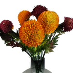 Large dahlia ball stems with plastic flowers and a wired shapable stem. Leaves are silk. Can be used to make arrangements with our other artificial flowers or as decorations on their own. Each stem measures 70cm overall height x 10cm. These are easy to cut down shorter using a pair of wire cutters if required. Some of our photos show vases to give an idea of size and possibilities for arrangement, but no vases or planters are included with this foliage.