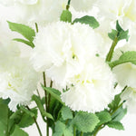 Leaf Design Product. White artificial carnation stem. Can be used to make arrangements with our other artificial flowers or as decorations on their own. Each stem measures 70cm overall height x 15cm wide and has four flowers. Flowers are silk. These are easy to cut down shorter using a pair of wire cutters if required. Some of our photos show vases to give an idea of size and possibilities for arrangement but no vases or planters are included with these flowers.