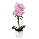 Leaf Design orchid plant. Measures: 50cm tall x 20cm x 20cm. The overall measurement is given at the tallest point as measured from the floor. This plant is potted in a plastic weighted pot.Realistic artificial orchid plant with real touch leaves, glued fixed gravel base, potted in a plastic decorative pot as shown. 9 real touch flowers. Pot is plastic in a silver honeycomb design and measures 10cm (h) x 12cm (w) Overall height as arranged in our photos 50cm. Stems are wired and this plant can be arranged to your requirements.