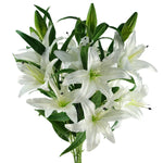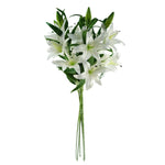 Leaf Design Product. Pack of 6 x White lily artificial flower stems. Can be used to make arrangements with our other artificial flowers or as decorations on their own. Each stem measures 100cm overall height x 22cm wide x 22 deep and has 3 flowers and a bud. Flowers are silk. The stems are wired so these can be shaped and bent to arrange. These are easy to cut down shorter using a pair of wire cutters if required. Some of our photos show vases to give an idea of size and possibilities for arrangement but no vases or planters are included with these flowers.