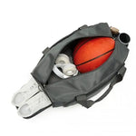 The front features two zippered pockets, ideal for easy access to small essentials. On the left side, there’s a dedicated zippered shoe compartment, while the right side offers a slot pocket for water bottles or umbrellas.